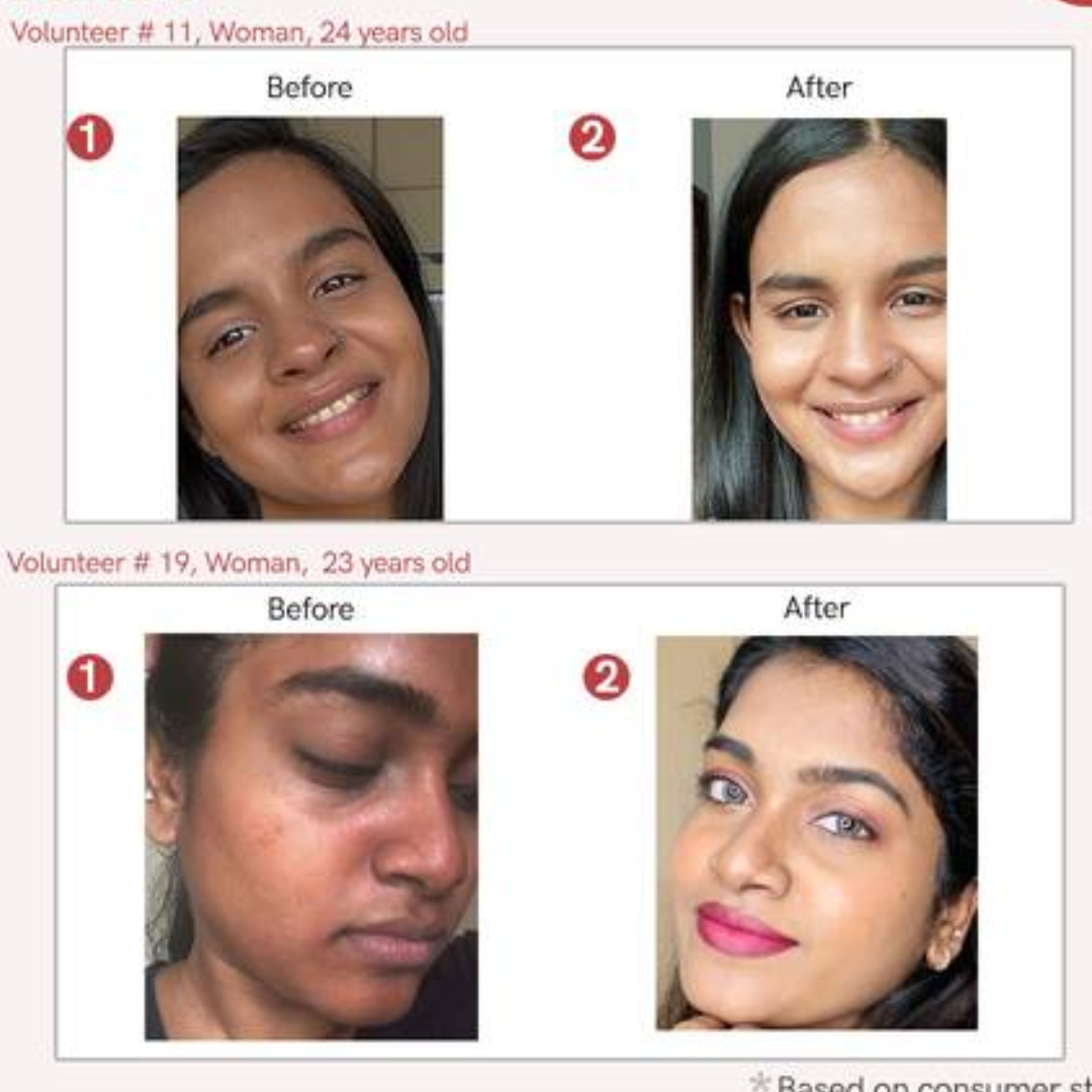 Proven Results: Visible reduction in tan, dark spots, and acne marks—as shown in before & after consumer tests.